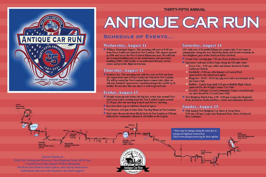 If details arent yet available check back often. We are adding more and more information every day. The 35th annual Antique Car Run is on for August 14th.